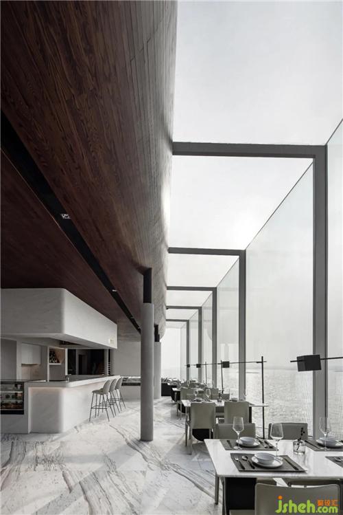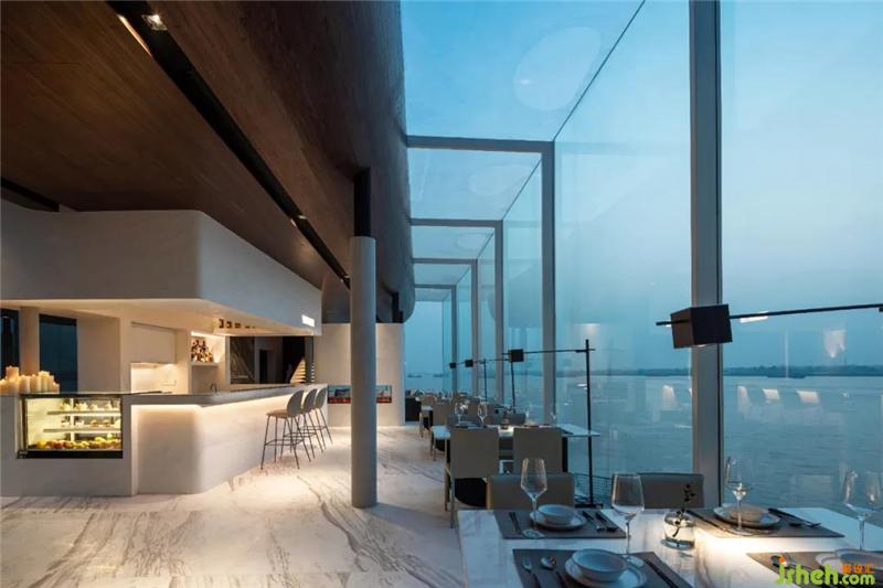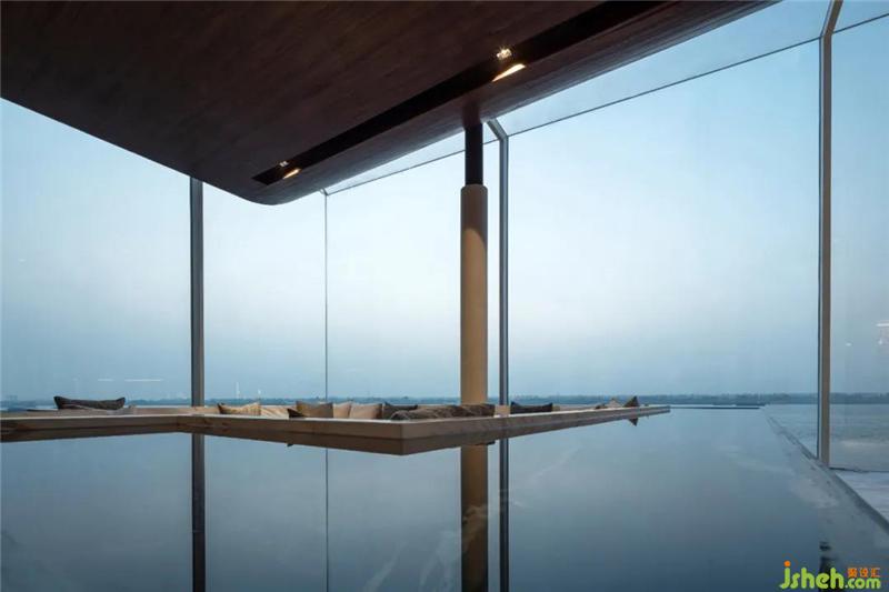 設(shè)計(jì)師為空間不斷注入新鮮感,在下沉?xí)蛷d周?chē)鹨黄鼐坝^,望向遠(yuǎn)處,水面無(wú)限延伸出空間外,與江水融為一體。