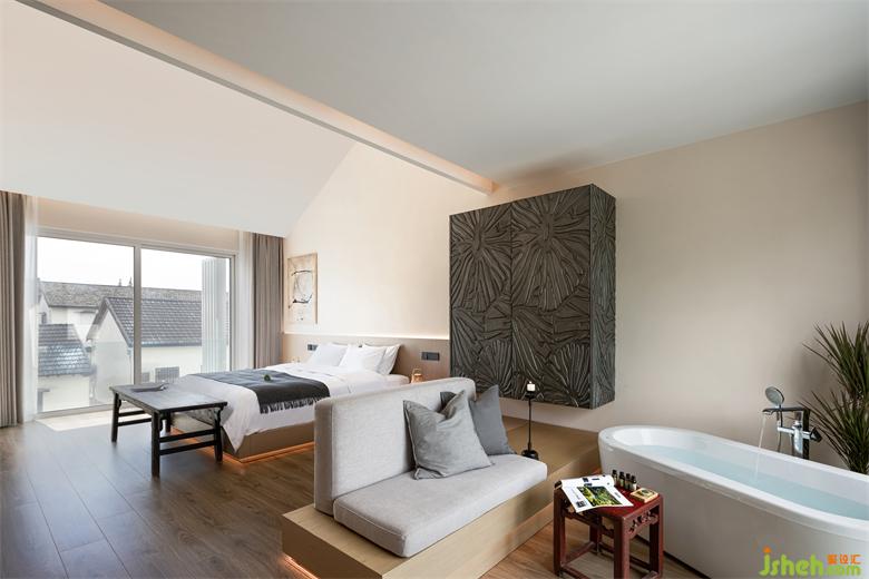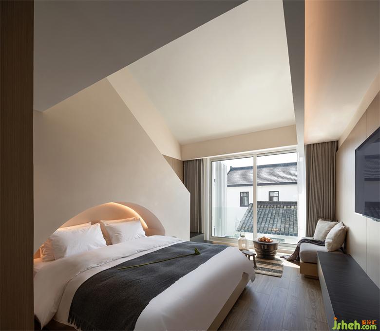 保留原本屋頂?shù)钠旅娼Y(jié)構(gòu),loft房間將空間每一處都利用到極致,燈光與空調(diào)藏入結(jié)構(gòu)中,最大化地讓空間變得極簡純粹。
