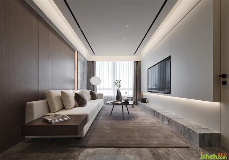 Rough marble textures form a strong contrast with the smooth wood veneer, and an area is opened in the porch ark for the change of shoes, which skillfully utilizes the function of space.