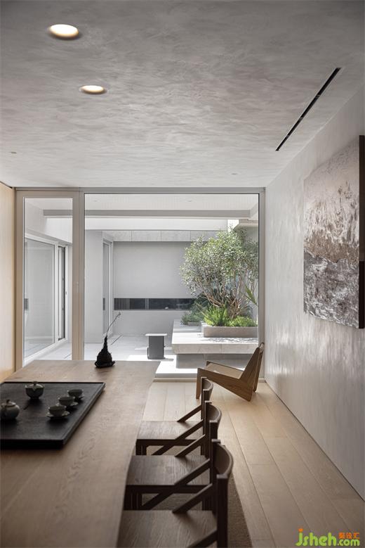 In the layout of the space, the dining room, living room and other activity areas are distributed around the sunken courtyard, so as to achieve the spatial feeling of one scene and one scene. The garden landscape is reflected into the interior through the floor-to-ceiling glass, and the outdoor natural environment interacts with the interior, further awakening people's beautiful yearning for nature.