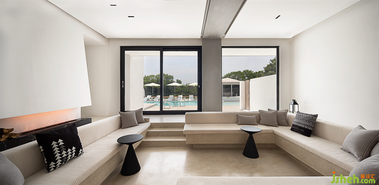 客廳內(nèi)的下沉式卡座與壁爐結(jié)合,在比例平衡的構(gòu)造中感受空間的極簡美。蘇州民宿設(shè)計師將通往二層的樓梯間擴出方形黑色體塊,頗有站在甲板上遠眺海島風景的詩意。