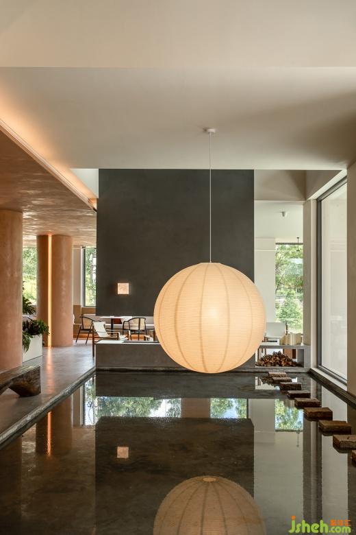 進(jìn)入室內(nèi),一方靈動(dòng)的水景,水波蕩漾,寧靜悠遠(yuǎn)。民宿設(shè)計(jì)光透過燈照在水面上,如日落時(shí)分,撐舟湖上,水面倒映的落日。