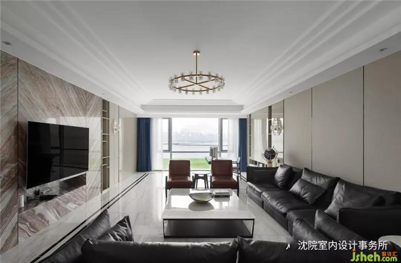 整面落地窗的設(shè)計使獨墅湖景一覽無余,藍色窗簾和圓桌的點綴搭配更使家于景相互融合,圓形金屬水晶燈凸顯整體層次感。