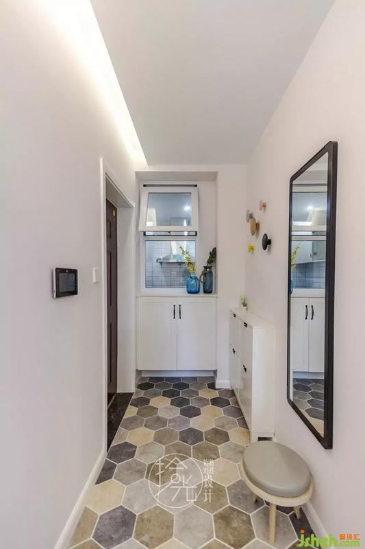 【入戶玄關(guān)】圓凳,掛鏡,掛鉤。鞋柜是從廚房偷出來的面積制作的。