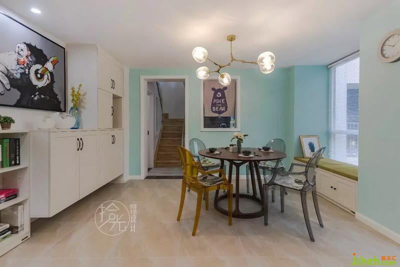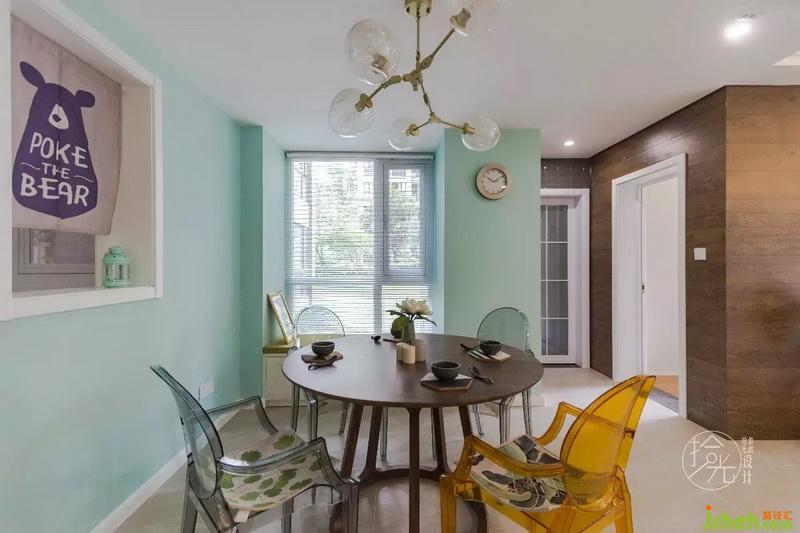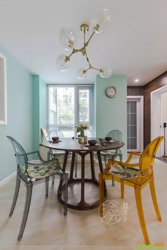 【餐廳】一樓采光不好,所以胡桃木配淺色墻面。通透的幽靈椅,讓空間更舒服。