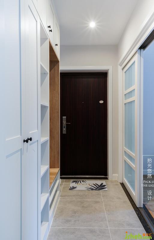 有奔波之后回家可以坐著換鞋的卡座,到家就希望你解放辛苦的雙手,設(shè)計了鏤空隔板可以放包包和鑰匙,對面是玻璃推拉門,過道有光就不自覺卸下了一身的疲倦