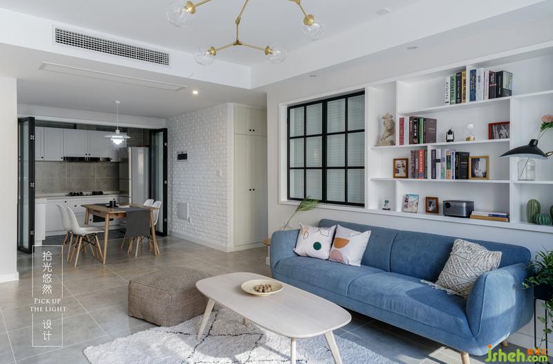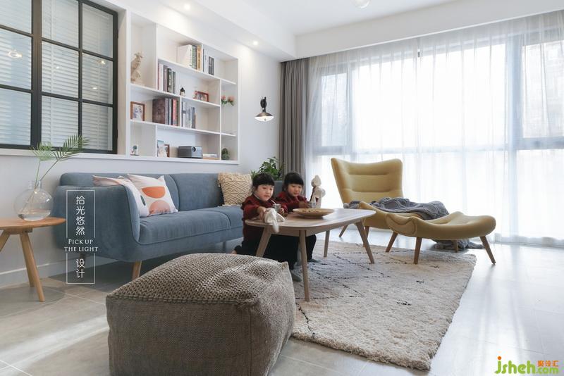 沙發(fā)背景墻的一邊是鋁合金邊框噴黑色氟碳漆窗扇,它還構(gòu)成了一個有意思的生活伏筆,另一邊是現(xiàn)場做的裝飾架,可以放下有關(guān)家人的珍貴瞬間