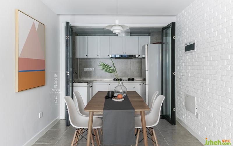 封了原本生活陽臺與廚房之間的門,才讓廚房用起來更順手,透明玻璃做的折疊門能完全打開,在餐廳搭配了明亮的裝飾畫,認(rèn)認(rèn)真真陪在家人身邊吃每一頓飯