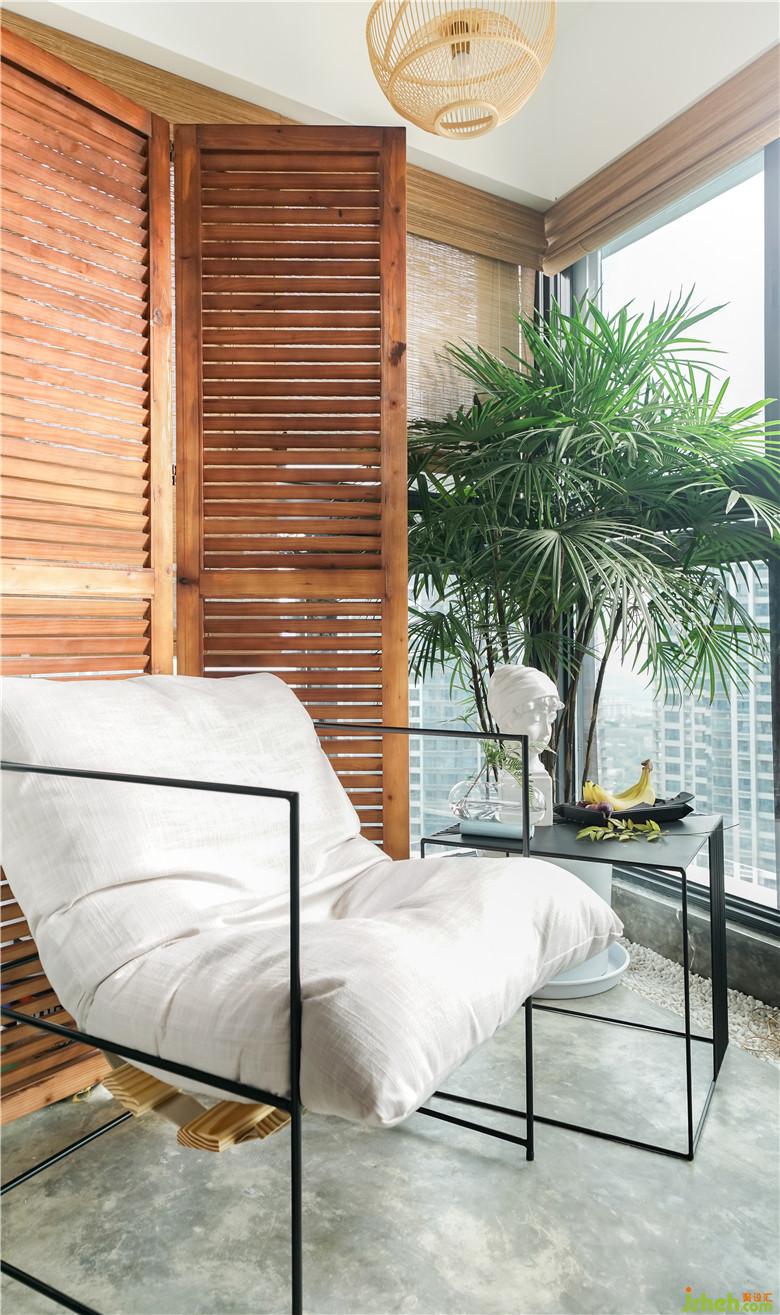 水泥地面,做了拋光處理,日式竹簾,白色小石子營造休閑的氛圍,屏風(fēng)隔斷遮擋空調(diào)外機(jī)