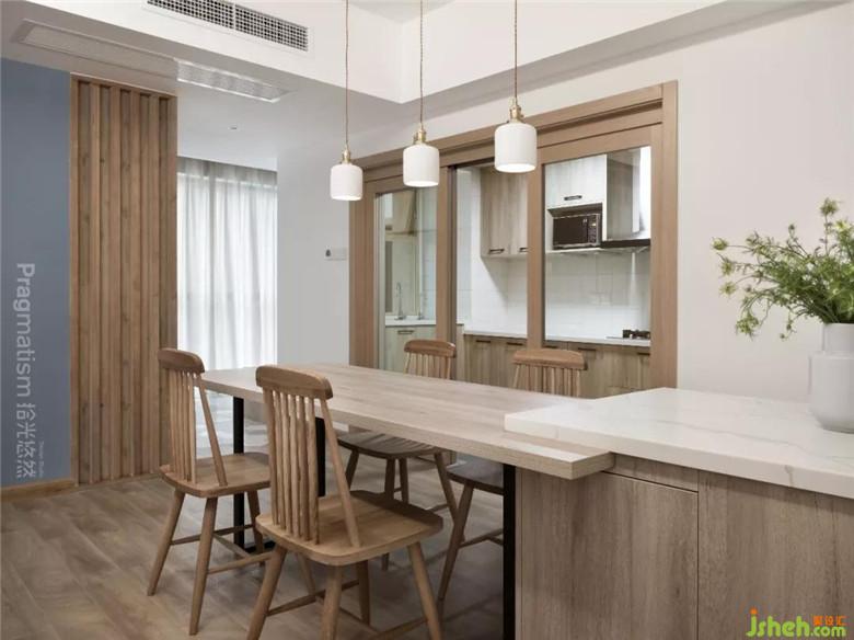 餐廚融入木質(zhì)及玻璃元素,打造簡(jiǎn)潔日系風(fēng)同時(shí)彌補(bǔ)餐廚通光不足的缺點(diǎn),冰箱放置于廚房就近的功能區(qū),擴(kuò)大廚房實(shí)用面積增加烹飪樂趣