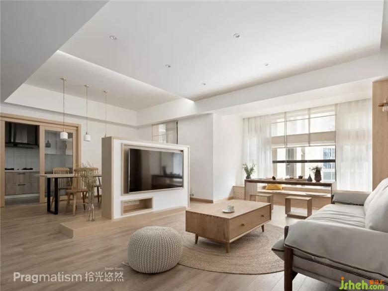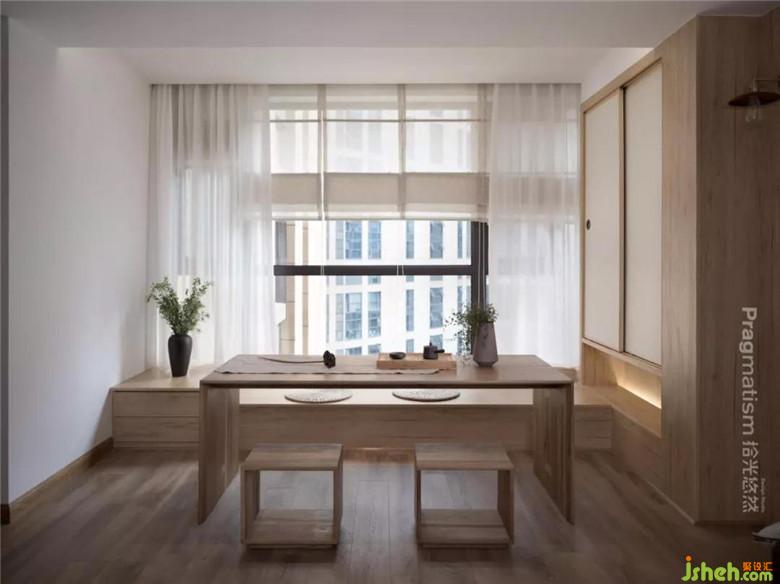 電視墻讓客餐廳區(qū)域劃分更明確,客廳采用無主燈設計,便于清潔與照明,茶臺采用隼結構拼接不使用一釘一鉚,還原本心回歸自然