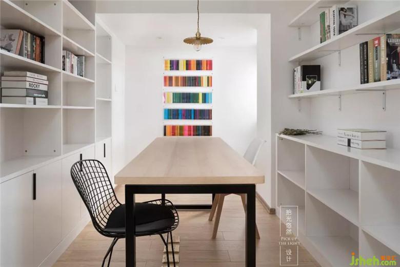 原本二樓是三間布局不合理的臥室,改造以后,變成一個包含衣帽間、書房和主衛(wèi)的超級主臥,臥室簡單素雅,用重色小小點綴,燈的顏色和材質(zhì)豐富了空間觀感