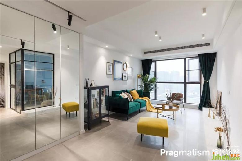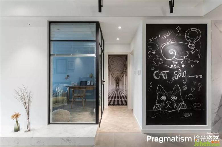 在設(shè)計(jì)多功能房時(shí),將轉(zhuǎn)角的墻面全部設(shè)計(jì)成玻璃墻體。一方面來(lái)的客人有對(duì)貓毛過(guò)敏的話就可以做一間隔離室;二是當(dāng)貓咪們獨(dú)自在客廳玩耍時(shí)不會(huì)因?yàn)檎也坏街魅硕械焦陋?dú)焦慮。