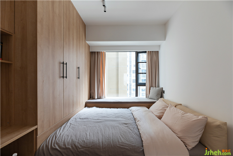 從改造上,采用榻榻米的形式壓縮空間,增加衣物空間的收納,作為偶爾留宿使用。書桌和書柜提供了業(yè)主一個隱私的工作與休閑的場所。
