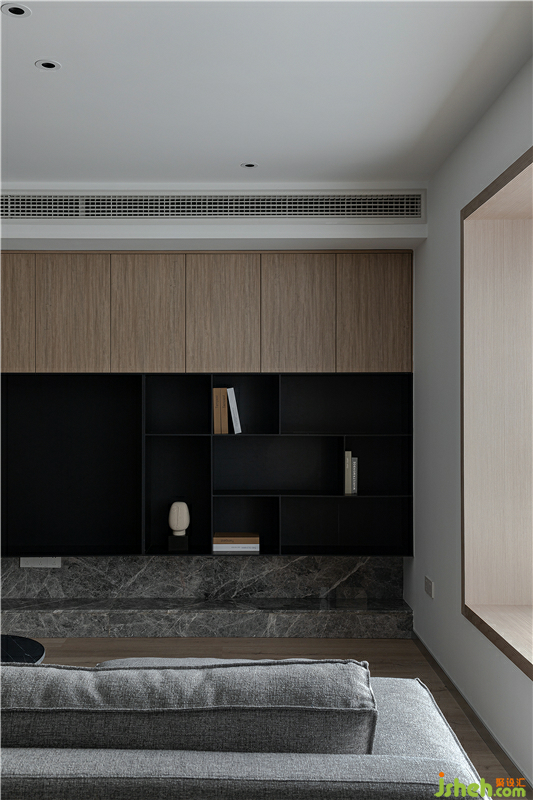 屋主喜歡比較暗黑、穩(wěn)重的調(diào)性,無論是背景墻還是客廳+老人房的公用墻,都做了置物架,方便未來屋主展示他們的收藏和書籍。裝修設(shè)計(jì)