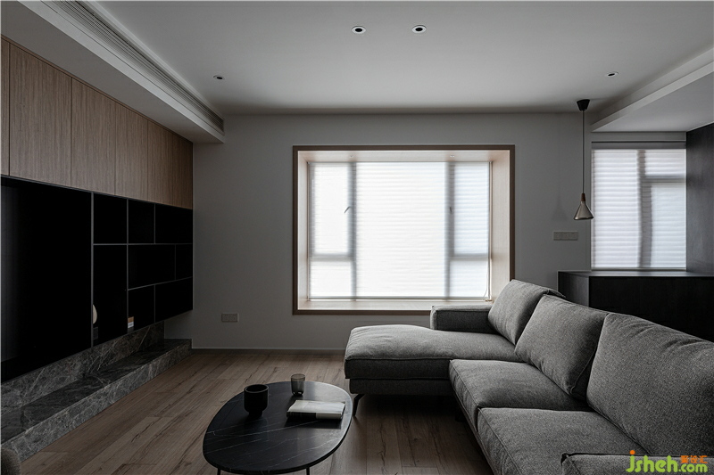 客廳采用的無主燈設(shè)計(jì),是讓整屋保持簡潔的要點(diǎn)之一。飄窗臺預(yù)留的燈位與客廳區(qū)域的燈光達(dá)到一個照明平衡,飄窗做木飾面裝飾墻體打破傳統(tǒng)大理石造型的生硬感。裝修設(shè)計(jì)
