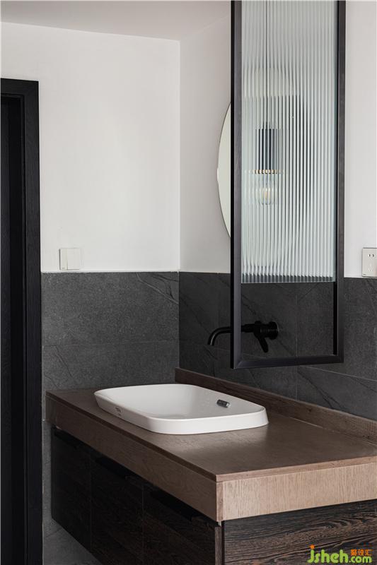 改造后將洗面盆移出至過道,得到一個更舒適的使用空間,在洗面盆側(cè)邊增加懸空的長虹玻璃隔斷,同時增加氛圍吊燈,透過玻璃光影更加有層次感。