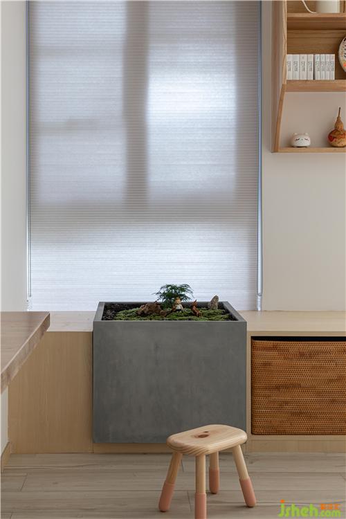 入戶左側(cè)是鞋柜的位置,通過中間鏤空的設(shè)計,預(yù)留了回家即可放置包包的位置。鞋柜旁則是暗藏式推拉門,玻璃是用的大燈芯,透光不透明,有質(zhì)感,玻璃門后面就是我們的洗衣及簡易晾曬空間。