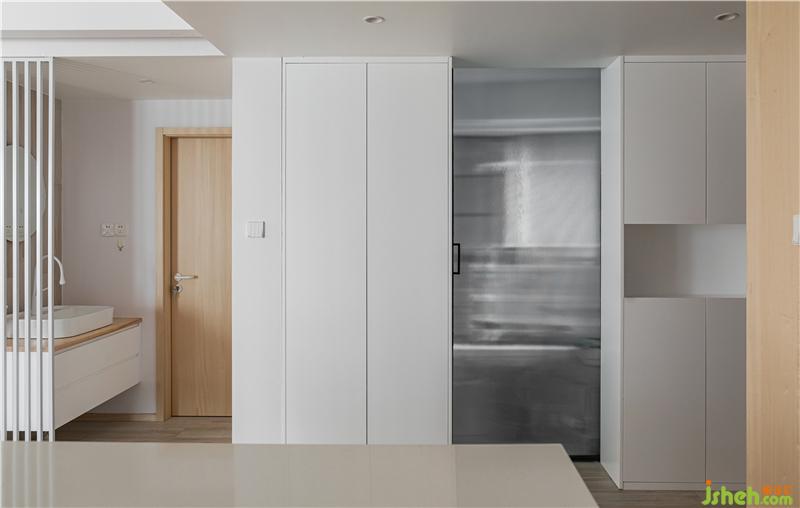 我們將中央空調(diào)的出風口放在了墻體的立面,左側(cè)的門洞內(nèi)是步入式衣帽間,與衛(wèi)生間相互連接的門洞,我們采用了日本的折疊門,性價比高,不占用空間且防水耐用。