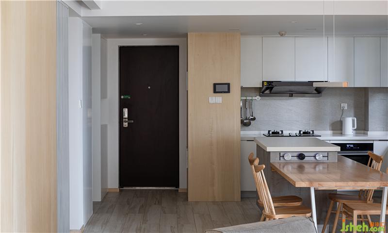 因為右側(cè)一排都是房門,為了弱化這種感官,我們通過梨木實木面板,做了隱形門,讓空間看上去更加干凈與整體。