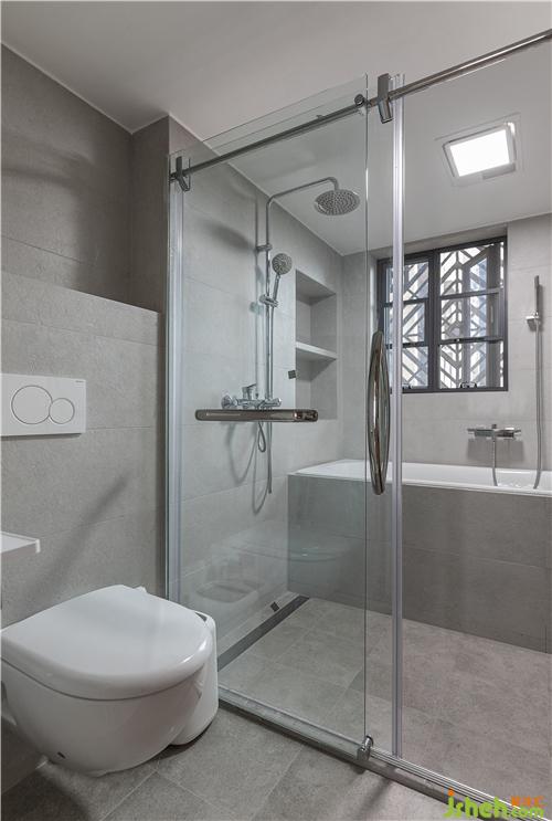 次衛(wèi)空間較小,所以沒有做淋浴房,用一塊透明玻璃作為隔斷,我們在淋浴空間與馬桶之間設(shè)計了斷水槽工藝,保證水不會流出來。