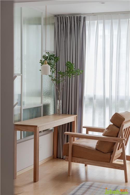 中間通過4種不同的藝術(shù)玻璃進行了隔斷,透光不透明。當父親在主臥的書房閱讀時,也能大致觀察到小朋友在客廳陽臺的活動。