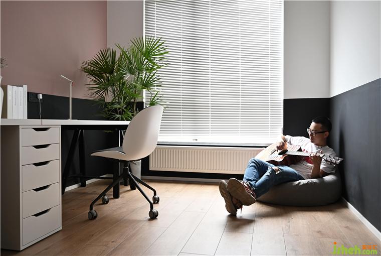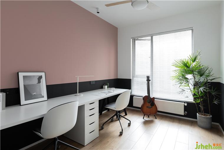 書(shū)房的乳膠漆顏色采用了黑色半墻,靠近書(shū)桌的那面墻運(yùn)用了業(yè)主喜歡的臟粉色處理,增加了整個(gè)空間的層次感。