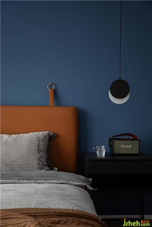 主臥的背景墻面刷了深藍(lán)色乳膠漆,烘托整個(gè)空間寧?kù)o,深邃,讓人完全可以放松下來(lái)。