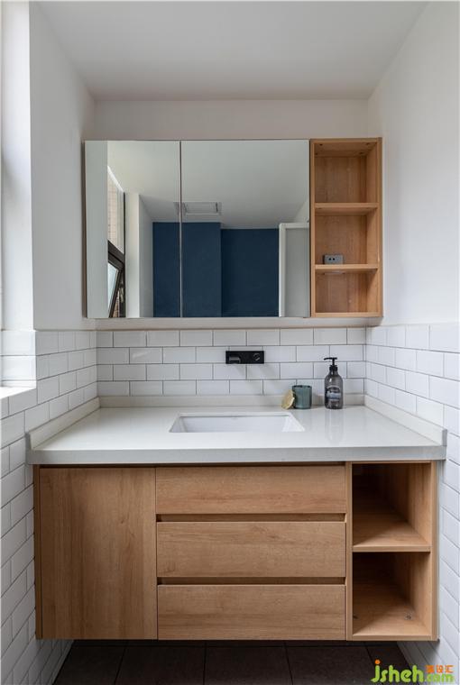 進(jìn)入主衛(wèi)的門(mén)考慮了日本的折疊,性價(jià)比顏值都很高,而且耐水耐用。因?yàn)椴辉O(shè)置淋浴對(duì)防水的要求不高,所以主衛(wèi)考慮了面包磚半墻的形式,空間顯得更精致。