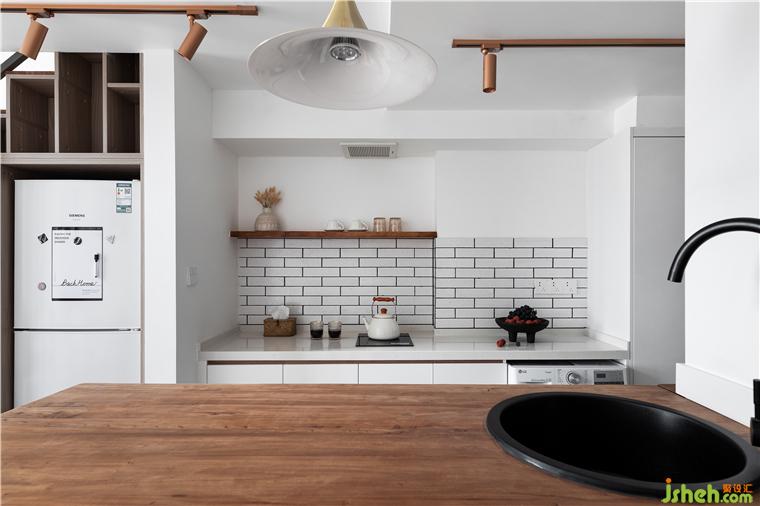 吧臺(tái)與餐桌相互結(jié)合,小水槽就近設(shè)計(jì)在吧臺(tái)上邊緣,無論是吃一份簡餐還是水果,有了它的存在就不用手忙腳亂的準(zhǔn)備食材和清洗餐杯、水果了。吧臺(tái)與對面櫥柜一起組成開放式餐廚空間,滿足使用者輕度餐飲,左邊的冰箱門上,寫著小兩口對即將到來的客人的祝福與期待。