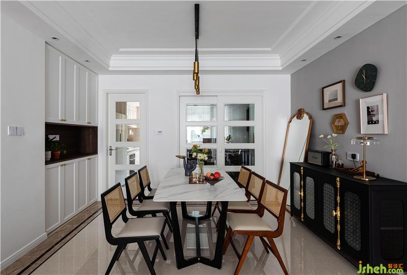 電視背景墻連通餐廳的墻面,采用了?;技尤槟z漆的處理方法。同時(shí),裝修設(shè)計(jì)增加了餐邊儲(chǔ)物功能。廚房保留原始結(jié)構(gòu),更換了櫥柜的柜門拉手,從小細(xì)節(jié)上改變整體效果。