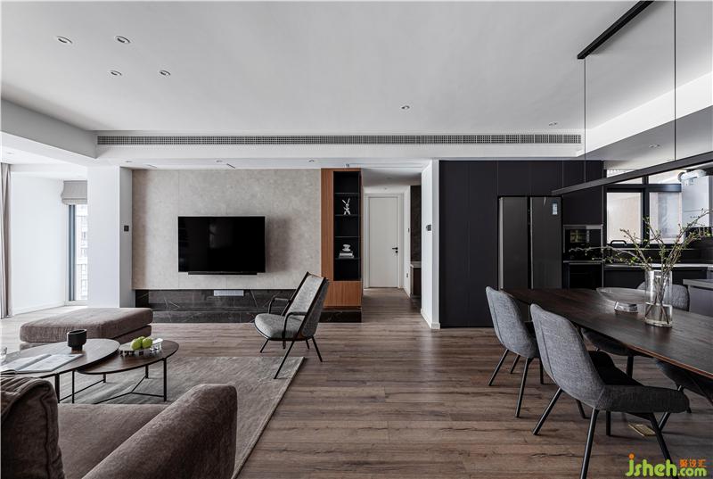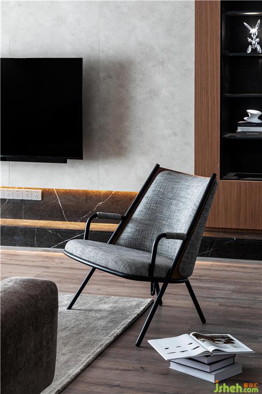 客廳處由于承重墻的限制,并沒(méi)有做過(guò)多的改造。設(shè)計(jì)的小心思放在了電視背景墻,室內(nèi)設(shè)計(jì)師選擇使用四種材質(zhì)碰撞,并將背景墻延伸至轉(zhuǎn)角過(guò)道處。同時(shí)背景墻后的兒童房,讓出小部分空間給到過(guò)道,使延伸至過(guò)道的電視背景墻,也擁有了強(qiáng)大的收納功能。