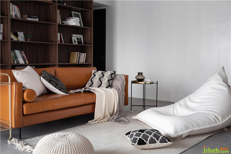 拆除了原本的陽臺推拉門,將陽臺空間納入客餐廳??蛷d沒有設(shè)置電視或投影儀,取而代之的是一整面大書柜。沙發(fā)的狀態(tài)是不固定的,既可以面向書柜,也可以面向一旁的白板墻,甚至可以面向陽臺與孩子一起玩?;印;野酌蘼橘|(zhì)地的懶人沙發(fā),是整個空間靈活調(diào)動慵懶舒適情緒的調(diào)節(jié)器。