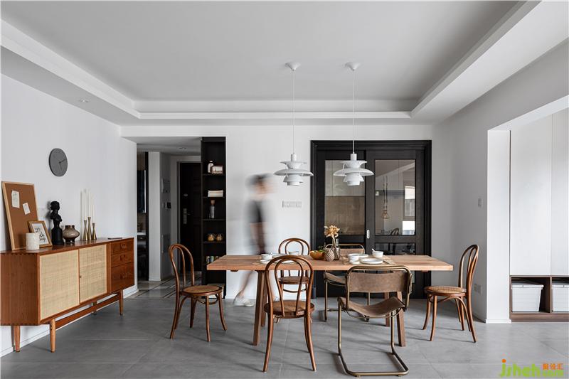 在戶型上,玄關(guān)、廚房、生活陽臺、衛(wèi)生間的結(jié)構(gòu)室內(nèi)設(shè)計師沒有做很大改造。主色調(diào)以黑白棕色調(diào)為主,餐廳擺放了一張大餐桌,輕松滿足全家的聚會,旁邊的餐邊柜承載了餐廳的收納。小推車可以滿載零食和酒水,靈活的服務(wù)于客廳或者餐廳。