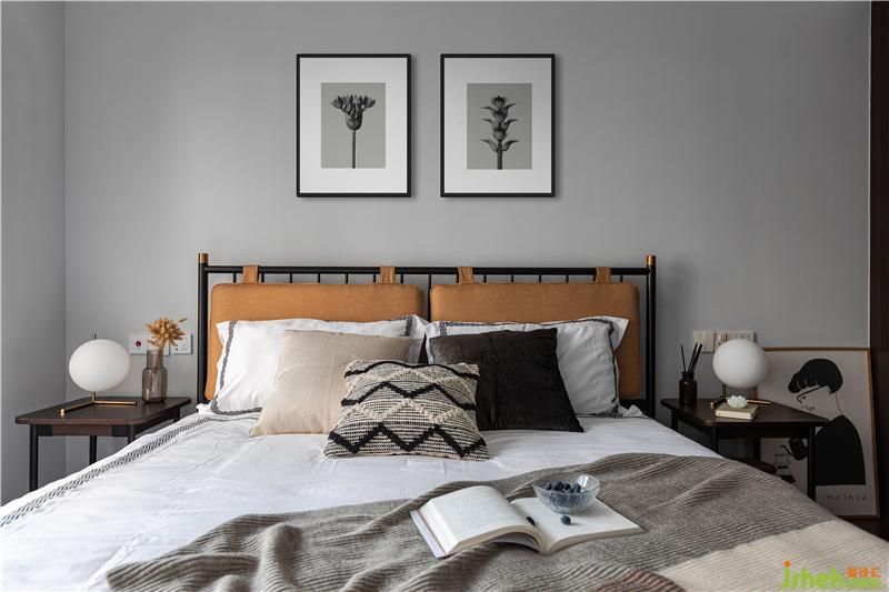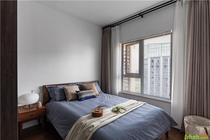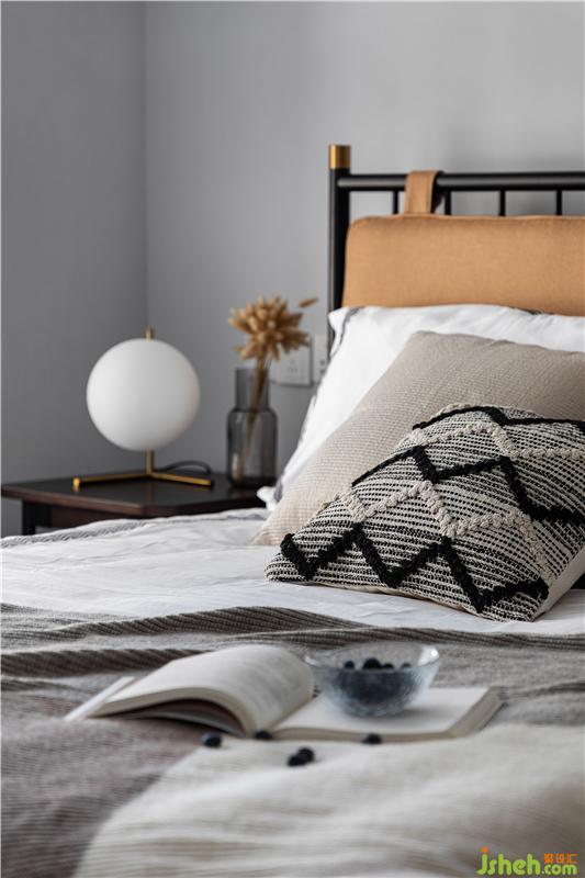 主臥保留了原開發(fā)商的衣柜和地板,利用一張3m*2m的地毯,遮住精裝丑陋地面。柔軟舒適的棉麻床品與深色木邊幾的溫潤氣質(zhì)相呼應(yīng),是給睡眠開一個好兆頭。
