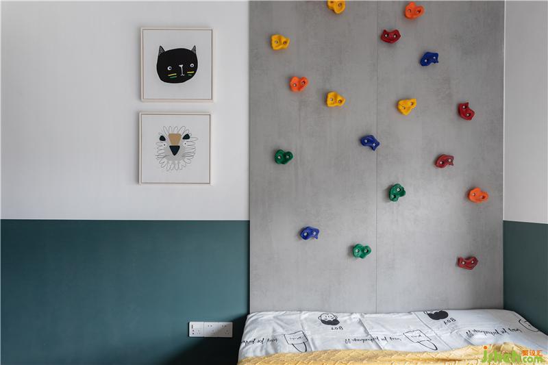 孩子的房間除了有一定的學(xué)習(xí)氛圍之外還應(yīng)給他們保留一些兒童純粹的天性。所以室內(nèi)設(shè)計師在榻榻米的衣柜對面做了一面不大不小的攀巖墻,讓孩子在這里攀爬消耗精力的同時也不會有太大安全問題。榻榻米的側(cè)面做了一圈開放的格柜,從小就可以培養(yǎng)孩子養(yǎng)成將玩具定時收納進(jìn)他們合適位置的習(xí)慣,也便于就近收納進(jìn)去。
