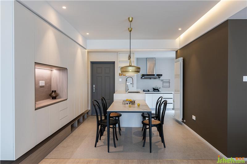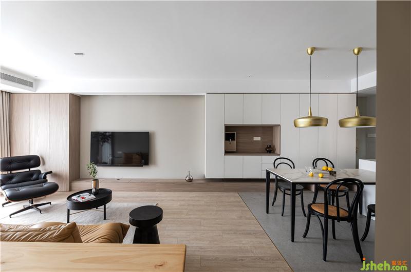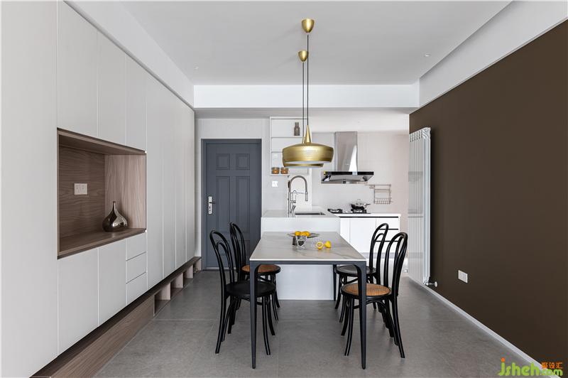 入戶后盡收眼底的客餐區(qū)是白色基底搭配特調(diào)的深淺咖色上墻,是理性的土老師與溫柔的琪姐之間的魅力碰撞?;A(chǔ)的收納功能林立在入戶兩側(cè),既收納四季鞋類同時還能收納客餐廳雜物以及小朋友的玩具。