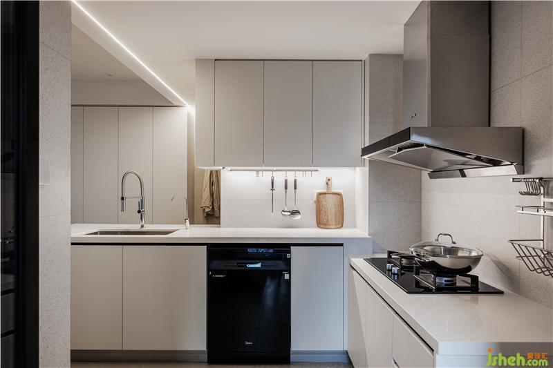 打通廚房與餐廳的隔斷,L型的廚房島臺從入戶處開始延伸。