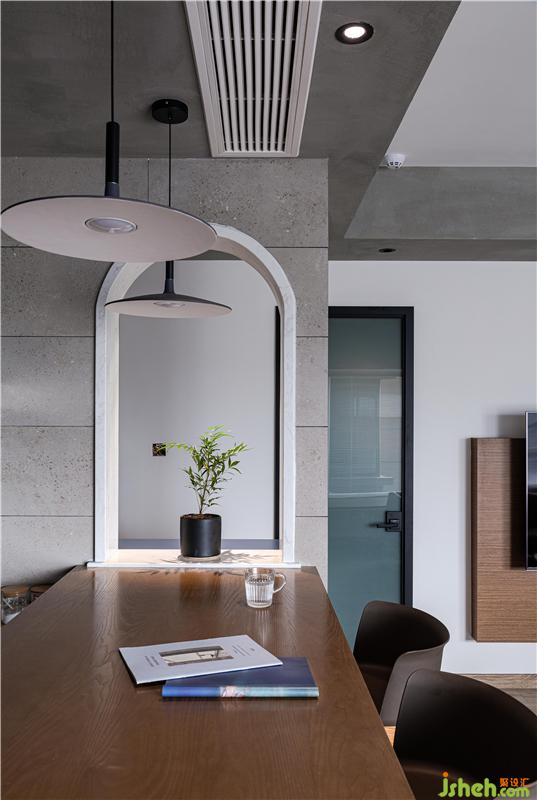 在設(shè)計(jì)玄關(guān)的時(shí)候故意把這個(gè)空間的色調(diào)調(diào)的比較暗,營造一場與明亮辦公環(huán)境形成反差的歸家氛圍,廚房與玄關(guān)的墻體之間利用石材做了鏤空的拱形造型。