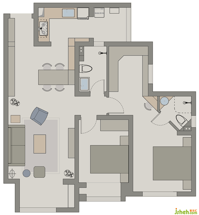 利用玄關(guān)至廚房的轉(zhuǎn)角,將餐廳與廚房進(jìn)了結(jié)合,把餐桌與島臺(tái)放在櫥柜上面,一個(gè)有儀式感與煙火氣的餐廚區(qū)就這樣誕生了。