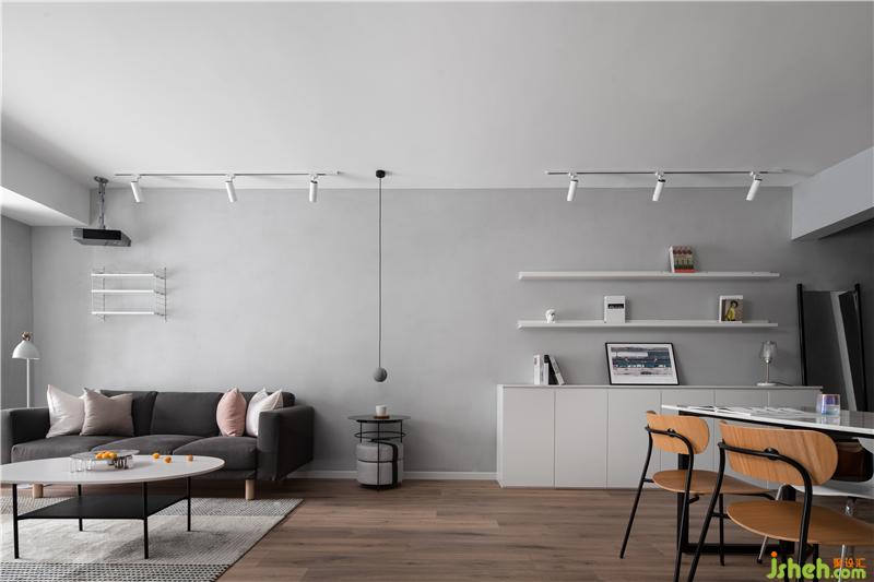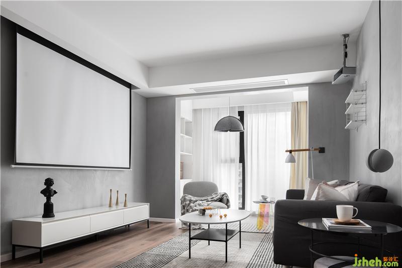 客廳把陽(yáng)臺(tái)作為閱讀區(qū)一起擴(kuò)入了室內(nèi),同時(shí)也作為客廳的補(bǔ)充座椅,投影儀更適合作為聚會(huì)與獨(dú)享下班時(shí)光的娛樂(lè)。