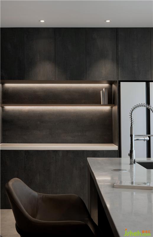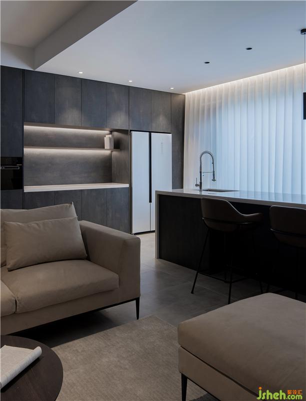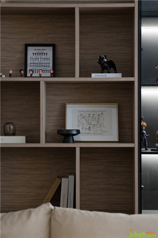 整屋柜體定制更好的滿足桃子姐的手工藝品收藏,男主人的手辦,甚至是夫婦倆的藏酒,再配合一組島臺設計,便完成了桃子姐烘焙、會客的心愿。