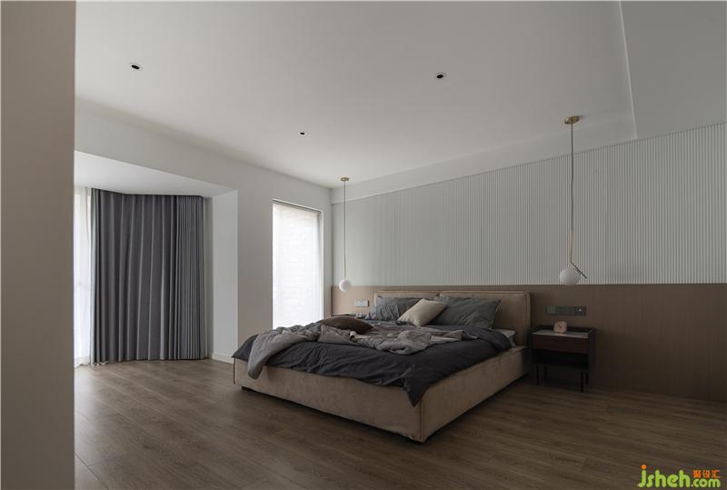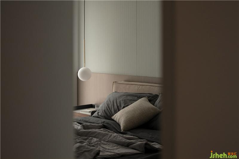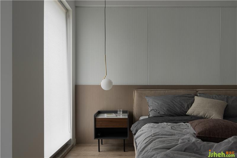 主臥進門左側空間交給了衣帽間與主衛(wèi)去發(fā)揮它們的優(yōu)勢作用,白色波紋板與棕色乳膠漆墻面組合呈現出了如今的床頭背景墻,給足了60㎡主臥的顏值。