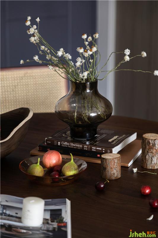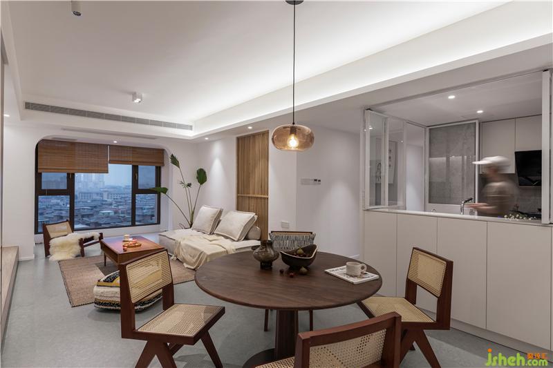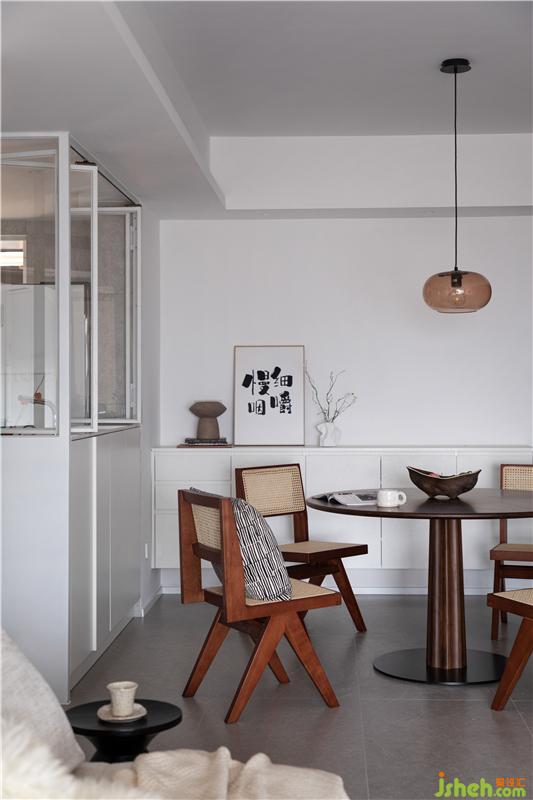 入戶后LDK格局映入眼簾,考慮到動線靈活性,我們在餐廳軟裝上選擇了二黑木作的胡桃木圓桌配合藤編椅作為生活的開場白,意為“團圓與相聚”,搭配一組L型白色餐邊柜配合就餐人的生活習(xí)慣。而這里也成了加菲Cash或躺臥休憩,或暗中觀察屋內(nèi)人一舉一動的常駐地,身邊隨時跟它的小伙伴-泰迪Dollar.