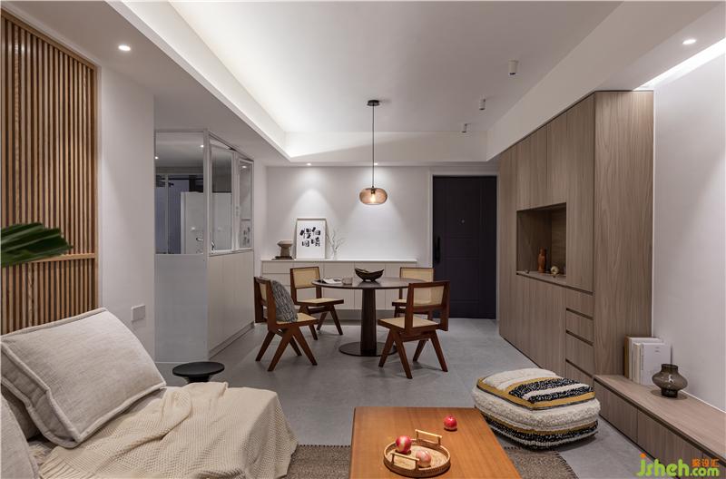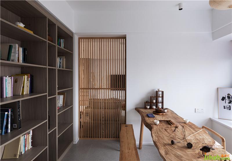 連接客廳與茶室的隔斷利用一扇木格柵,從而達到視覺上的空間延伸。正對窗戶的墻面以置物架的形式作為全家福和100多本書籍以及茶室物品的“家”。