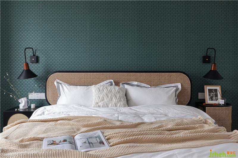 床頭背景墻我們選擇了奧麗芙的復古鎏金細節(jié)圖案的藝術(shù)墻紙,也是整個主臥空間的點睛之筆。AB款的藤編床頭柜相互照應(yīng)且獨立。