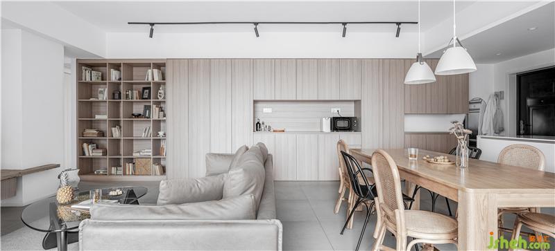 多功能集成柜,從左到右依次為書柜/展示區(qū)、中小雜物區(qū)、餐邊柜區(qū)、鞋柜區(qū)。而餐邊柜部分更是兼顧著起居和餐廚兩個區(qū)域的高頻使用。在柜體材質(zhì)上選擇了偏灰的直紋板材,造型簡潔硬朗。