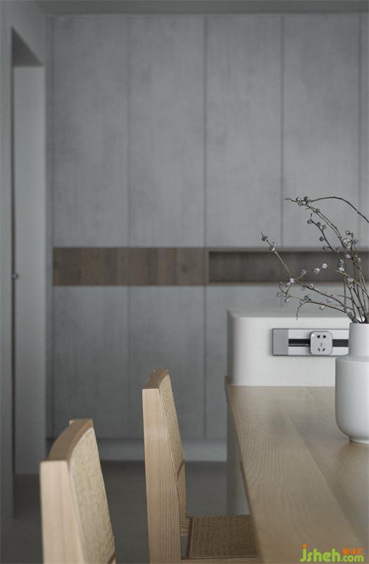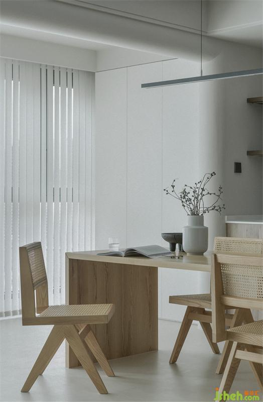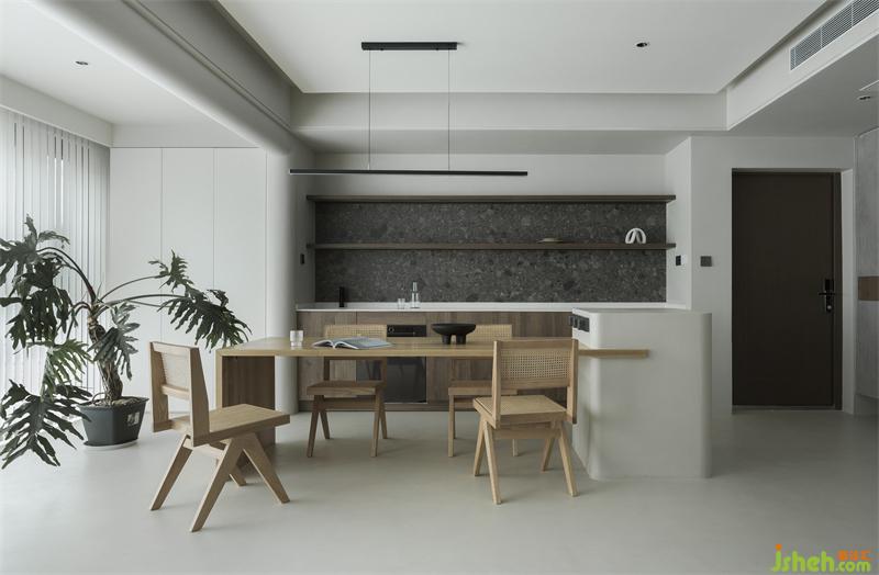 開發(fā)商提供的玄關(guān)柜設(shè)計(jì)不合理且不實(shí)用,選擇拆除重做后的柜體風(fēng)格更簡潔統(tǒng)一。餐廳由一整面墻的收納,與帶島臺(tái)的實(shí)木餐桌組成。