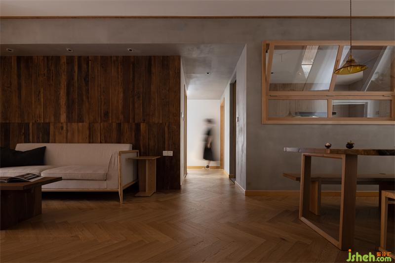 選擇紋理細(xì)膩、顏色溫潤的櫸木作為廚房半開放式窗框這兩個區(qū)域的主要木材,中和了老木材的穩(wěn)重與年代感。