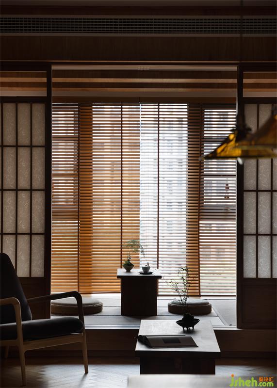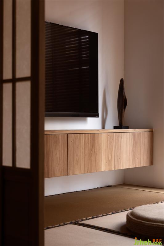 將原休閑陽臺(tái)塑造成多功能室,傳統(tǒng)古樸的推拉門運(yùn)用了傳統(tǒng)日式榻榻米推拉門的做法,以樟木和障子紙形成了多功能室與客廳的隔斷。